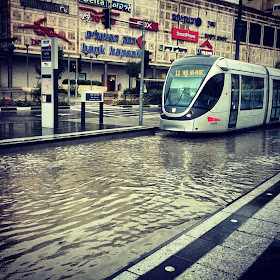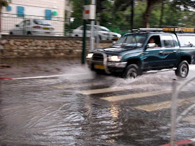 Rio Ayalon enchendo e o engarrafamento anormal provocado pelas chuvas.